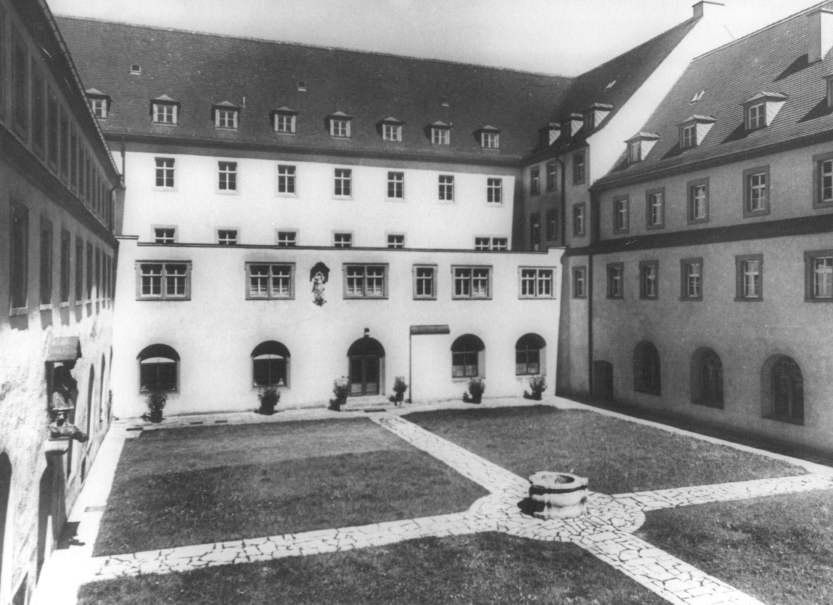 "Trotz der Inflation 1923 und dem damit verbundenen Verfall des Stiftungsvermögens gelang es Regens Dr. Kilian Meisenzahl, mit Hilfe einer Intervention Faulhabers in München, das Waisenhaus anzumieten und für die Zwecke des Seminars nutzbar zu machen. Auf Grund dessen konnte die Schülerzahl auf 200 steigen, was aber noch immer nicht für den weiterhin ungebrochenen Ansturm an Anmeldungswünschen ausreichend war, so daß 1927 ein weiteres Kilianeum für das Untermaingebiet in Miltenberg eröffnet wurde. ... [In diese Zeit ] fiel auch der Ankauf des Waisenhauses, der u.a. durch die erstmalig gewährten staatlichen Zuschüsse in Höhe von 20.000 RM ermöglicht wurde. Nach dem Wechsel im Regentenamt 1930 zu Dr. Vincenz Fuchs befürwortete die Diözesansynode 1931 einen umfassenden Umbau des Hauses. Da schon 1932 Dr. Philipp Kaiser als Leiter nachfolgte, ging der Generalumbau unter seiner Ägide über die Bühne. In der Zeit von 1935-1938 wurde das Knabenseminar, das nun alle Gebäudeteile des ehem. St. Afra-Klosters zur Verfügung hatte, zu einem modernen Internat ausgebaut, und das Stückwerk vergangener Baumaßnahmen zu einem Gesamtkonzept vereinigt. Auch eine neue Hauskapelle wurde im ehem. Waisenhaustrakt an der Südseite 1938 von Bischof Matthias Ehrenfried geweiht. In diesen Zeitabschnitt fielen auch die ersten Meinungsverschiedenheiten mit den Machthabern des Dritten Reiches, welche die Kilianisten stärker in ihren Erziehungsapparat einbinden wollten." (88)