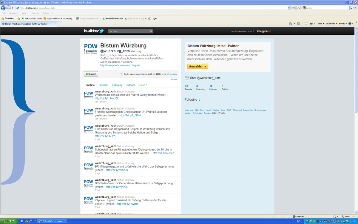 Würzburg (POW) Gleich auf zwei neuen Kanälen ist ab sofort die Pressestelle des Bischöflichen Ordinariats Würzburg (POW) erreichbar: Aktuelle Nachrichten aus dem Bistum Würzburg sind jetzt sowohl im sozialen Netzwerk Twitter (twitter.com) als auch als Nachrichtenabonnement im Internetformat RSS (Really Simple Syndication) beziehbar. „Mit dem Angebot ermöglichen wir rechtzeitig zur bevorstehenden Seligsprechung von Pfarrer Georg Häfner einen noch schnelleren Zugang zu den neuesten Meldungen“, erklärte Pressesprecher Bernhard Schweßinger am Montag, 9. Mai. Wer die Dienste kostenlos beziehen möchte, kann das am einfachsten über die Seite der Pressestelle (www.pow.bistum-wuerzburg.de) tun. Dort finden sich die entsprechenden Buttons, die nach Anklicken auf die weiterführenden Seiten führen.