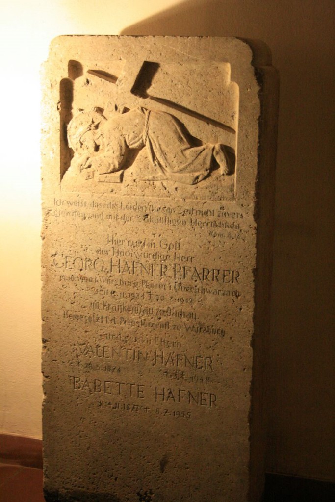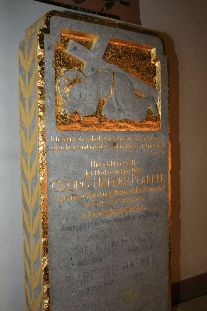 Am 18. September 1942 war die Urne Pfarrer Häfners auf dem Hauptfriedhof in Würzburg beigesetzt worden. Bis zur Exhumierung am 2. November 1982 zierte ein großer Grabstein den Beisetzungsort. Die Urne wurde am 9. Dezember durch Bischof Paul-Werner Scheele in der Kiliansgruft beigesetzt, den Grabstein bekamen die Verwandten von Pfarrer Häfner, Pauline und Bruno Stoy. Sie schenkten uns, durch die Vermittlung von Herrn Amberg, am 1. Dezember 2007 diesen Grabstein als eine kostbare Reliquie. Bereits am 3. Dezember wurde er durch den Bildhauer Kurt Grimm zu uns transportiert und direkt gegenüber der Eingangstüre unserer Kirche im Boden fest verankert. Was für eine Freude für uns!