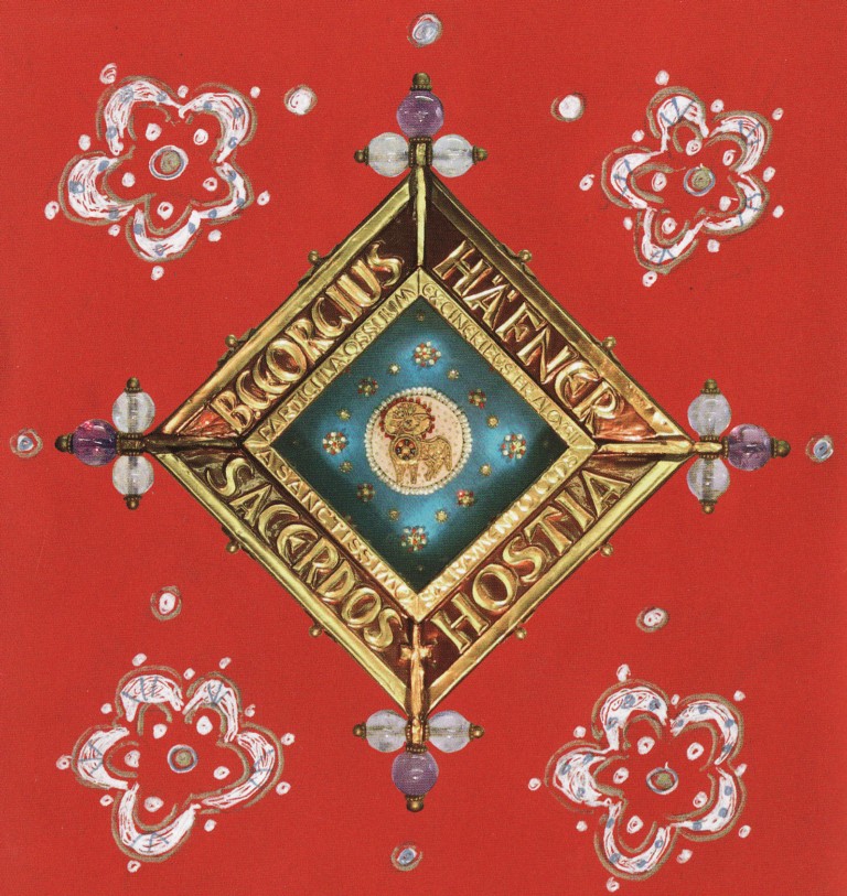 Doch der Grabstein ist nur ein Teil des Geschenkes. Goldschmied Michael Amberg fertigte zum Termin der Seligsprechung ein kostbares Reliquiar an, in dem sich von der Verbrennung im KZ Dachau ein Stück kalzinierten Knochens befindet. Diese Reliquie hatte Michael Amberg 1982 bei der Exhumierung seines Drittordens-Mitbruders erhalten. Sein Ordensname ist: Aloisius vom hlst. Sakrament. Das Reliquiar will nach Erklärung von Michael Amberg auf die Herrlichkeit des Himmlischen Jerusalem hinweisen, was durch ein über Eck gestelltes Quadrat – in Kreuzform angeordnet – mit 12 Edelsteinen aus Bergkristall und Amethysten zum Ausdruck kommt. „B. GEORGIUS HÄFNER SACERDOS ET HOSTIA“ „sel. Georg Häfner Priester und Opferlamm“ steht in großen Buchstaben auf dem goldenen Rand des Reliquiars, das eine reichhaltige Symbolik birgt. „Priester und Opferlamm“, so hatte der Mithäftling P. Sales Hess OSB aus Münsterschwarzach treffend seinen Leidensgenossen charakterisiert. Ein schmaleres Schriftband bezeichnet in lateinischer Sprache was die Reliquie birgt: „Ein Teil aus den Gebeinen aus der Asche des Frater Aloisius vom Heiligsten Sakrament Säkularorden der unbeschuhten Karmeliten“. Die Mitte symbolisiert die Hostie mit dem Opfer- und Siegeslamm Jesu Christi. Die Herzenswundes des Lammes birgt die kostbare Reliquie. Der rote Hintergrund verweist auf sein Martyrium, während blaue Kristallsteinchen in Kreuzesform seine Glaubenstreue zum Ausdruck bringen. Vier Perlen bezeugen seine innere Haltung: Gott ein reines Herz anzubieten. Die Unbesiegbarkeit des Lammes wird durch die sieben Hörner dargestellt, und die Korallen um den Heiligenschein des Lammes sind Zeichen für dessen Opferblut. Das goldene Lamm steht in der Hostie als Zeichen der mystischen Vermählung mit seiner geliebten Braut der Kirche. Der hellblaue Hintergrund des Reliquiars versinnbildet den Himmel als Paradies. Paradiesesblumen aus Kristallsteinen, Gold, Korallen und Perlen stehen für die Tugenden der Heiligen, die aus dem Brunnen der Leiden Christi und dem heiligsten Sakrament schöpfen. Die verborgene Beleuchtung von innen macht den Hinweis aus der Offenbarung des Johannes anschaulich: „Die Stadt braucht weder Sonne noch Mond, die ihr leuchten. Denn die Herrlichkeit Gottes erleuchtet sie, und ihre Leuchte ist das Lamm.“ (Offb 21, 23).