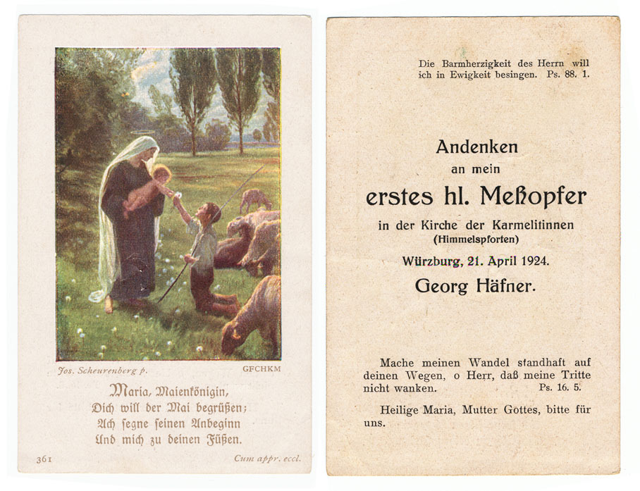 Zu den wichtigen Stationen aus Häfners Leben finden sich im Diözesanarchiv Bilddokumente: von seiner Erstkommunion, bei der er einen schwarzen Hut und eine weiße Fliege trägt, hin zu Bildern aus seiner Zeit als Ministrant und der späteren Primiz in der Kirche des Klosters Himmelspforten. „Die Barmherzigkeit des Herrn will ich in Ewigkeit besingen“: Der Psalmvers steht auf seinem Primizbildchen vom 21. April 1924, zusammen mit einer Mariendarstellung.