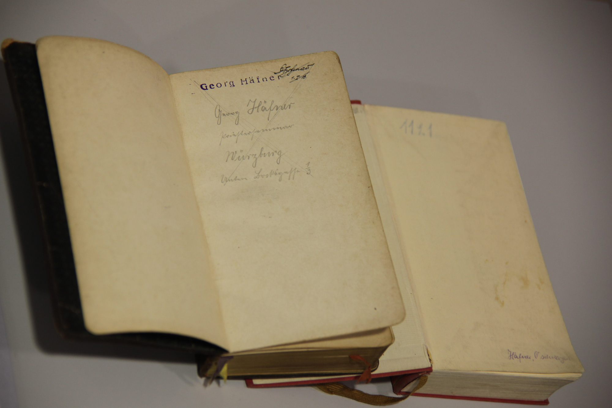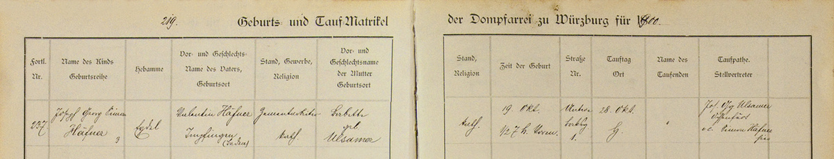 Die Dokumente veranschaulichen Häfners Leben, angefangen bei seinem Taufeintrag: Joseph Simon Georg Häfner ist auf dem vergilbten Blatt zu lesen. Geboren am 19. Oktober 1900, getauft am 28. Oktober durch Domkaplan Johannes Klug. Darunter ist ein verschnörkeltes „h“ zu erkennen: ein Hinweis, dass Häfner nicht in einer Kirche, sondern zu Hause getauft wurde.