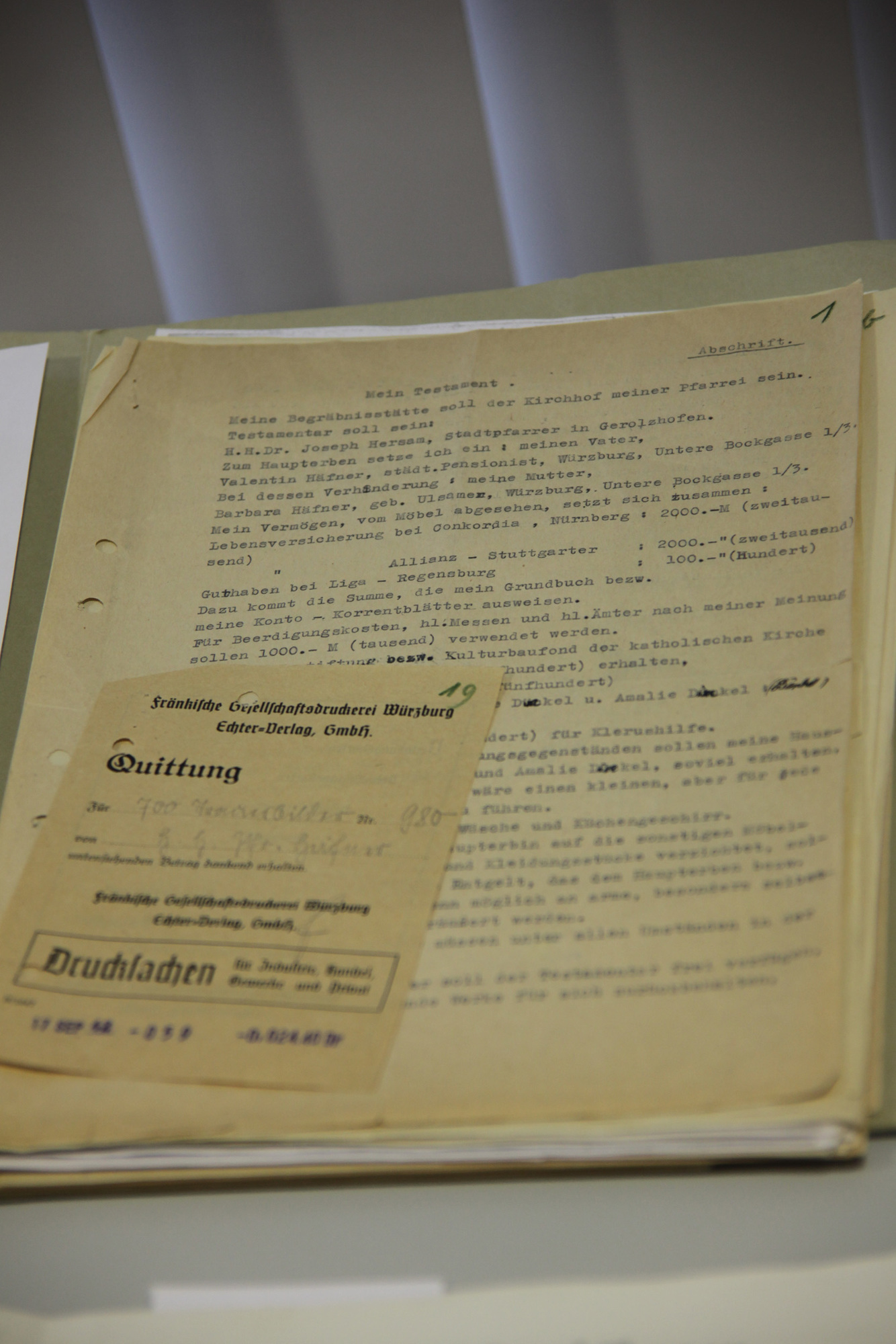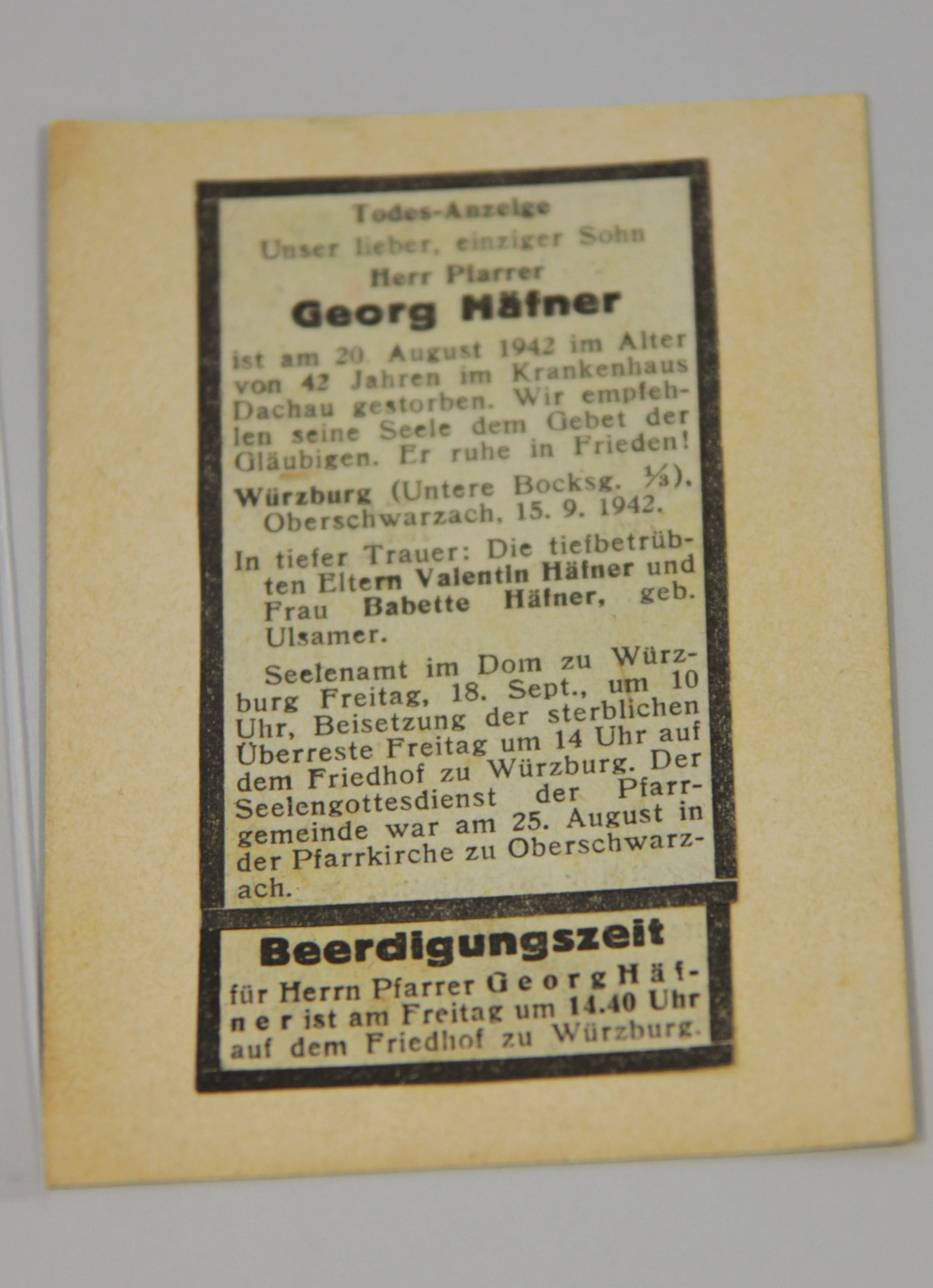 Auch Einblicke in Häfners Testament sind möglich. So schreibt er am 28. Juni 1941, dass er gern im Kirchhof seiner Pfarrei bestattet werden möchte und sich seinen Vater Valentin als Haupterben wünscht. 1000 Mark sieht Häfner für die Beerdigung vor, sie sollen aus seiner Lebensversicherung entnommen werden. Eine Quittung über 700 Sterbebildchen Häfners, die das Dekanat Gerolzhofen in Auftrag gab, liegt auch im Diözesanarchiv. Genauso wie ein Foto mit Häfners Verbrennungsmarke mit der Zahl 4950, anhand derer seine Asche identifiziert wurde.