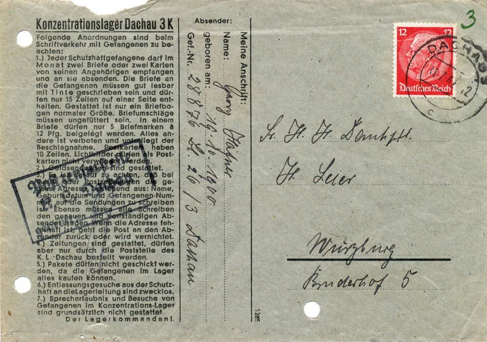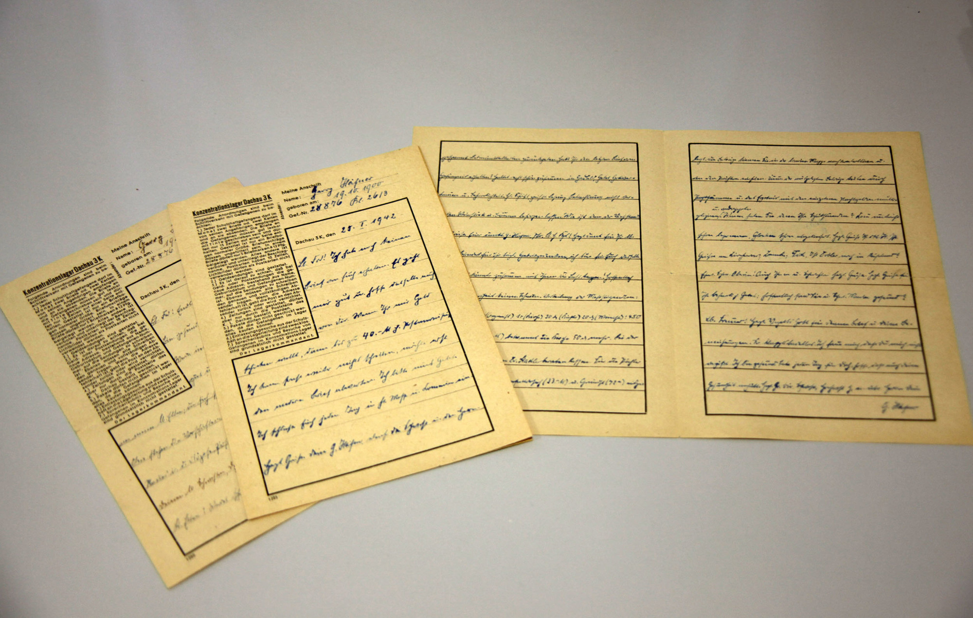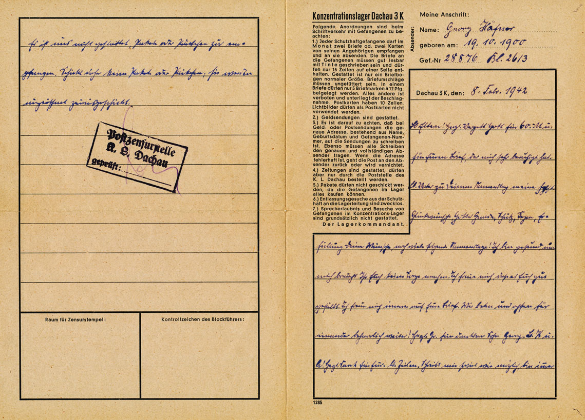 „Jeder Schutzhaftgefangene darf im Monat zwei Briefe empfangen. Gestattet ist nur ein Briefbogen. Pakete dürfen nicht geschickt werden. Besuche von Gefangenen sind grundsätzlich nicht gestattet.“ So lautet die Vorgabe, die maschinell auf einem frankierten Briefumschlag steht, den Häfner aus dem KZ an den Würzburger Domkapitular Heinrich Leier schickte. Das Dokument ist ebenfalls als Reproduktion im Archiv zu sehen, genauso wie ein von Häfner beschriebener Briefbogen aus dem Jahr 1942. Er schreibt von einem „gesunden Appetit“, den er im Lager habe. „So konnte Häfner einer Zensur entgehen“, erklärt Merz. Der Satz meint aber, dass Häfner kaum zu essen bekam.