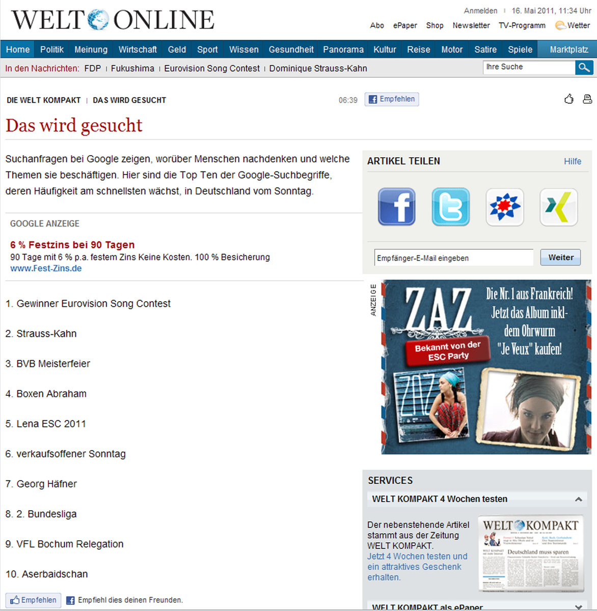 Würzburg (POW) In der virtuellen Welt Deutschlands hat es Georg Häfner am Tag seiner Seligsprechung unter die Top Ten geschafft: Laut Welt Online belegte der Name des Märtyrers am Sonntag, 15. Mai, unter den in der Internet-Suchmaschine Google in Deutschland eingegebenen Begriffen Platz sieben. Häfner ließ sportliche Ereignisse wie die bevorstehende Relegation des VfL Bochum und Aserbaidschan, das Heimatland der Gewinner des Eurovision Song Contests (ESC) 2011, hinter sich. Die Fernsehübertragung der Seligsprechungsfeier verfolgten nach Angaben des Bayerischen Rundfunks 180.000 Personen an den Fernsehgeräten. Der Marktanteil betrug 2,3 Prozent. Dass die Seligsprechung auch über die deutschen Landesgrenzen hin Beachtung fand, belegt der Pressespiegel der Onlineredaktion des Bistums Würzburg, der unter www.bistum-wuerzburg.de angesehen werden kann. Die Homepage www.georg-haefner.de besuchten am Tag der Seligsprechung 1289 Nutzer, die Bistumshomepage zählte an diesem Tag 2358 Besucher, doppelt so viele wie sonst an Sonntagen.