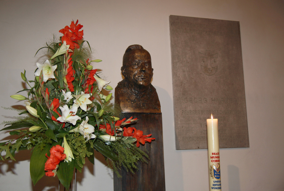 Georg Häfner wurde am 19. Oktober 1900 in Würzburg geboren und erhielt dort am 13. April 1924 in der Michaelskirche die Priesterweihe. Nach Kaplanstätigkeit in Motten (1924), Goldbach und Mürsbach (1925) sowie Altglashütten (1928 bis 1934) wurde er Pfarrer in Oberschwarzach. Sein unbeirrtes und mutiges Eintreten für die Kirche führte nach Denunziationen zu Vernehmungen durch das NS-Regime und schließlich zur Inhaftierung im Oktober 1941. Am 12. Dezember 1941 wurde Häfner in Dachau eingeliefert. Nach großem Leiden durch Krankheit, Unterernährung und Misshandlung starb er dort am 20. August 1942. Seine Urne wurde zunächst am 18. September 1942 im Würzburger Hauptfriedhof beigesetzt. Am 9. Dezember 1982 wurde sie unter Beisein von Bischof Dr. Paul-Werner Scheele in die Krypta der Neumünsterkirche überführt. Am 23. Juli 1992 wurde das Bischöfliche Erhebungsverfahren zur Seligsprechung eingeleitet und am 31. Mai 2002 abgeschlossen. Danach wurden die Unterlagen an die Selig- und Heiligsprechungskongregation in Rom weitergegeben, wo sie geprüft wurden.