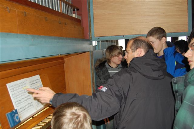 Richtig laut wurde es in der evangelischen Kirche St. Johannis, als Pfarrer Christian Herpich den Schülerinnen und Schülern einen kurzen Einblick in die Funktionsweise einer Orgel gab. Die große Besonderheit daran war allerdings, dass einige Teilnehmer der Tour dieses Instrument selbst einmal ausprobieren durften. Auch wenn dabei nicht alle die richtigen Töne trafen, war es für alle ein spannendes Erlebnis.