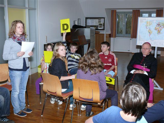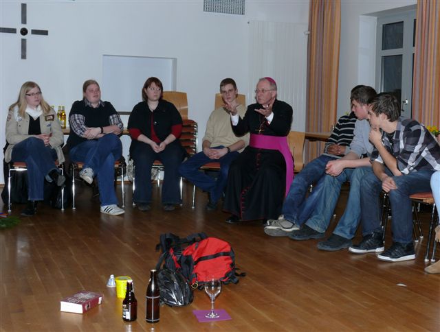 Die Jugendlichen und jungen Erwachsenen hatten die Möglichkeit Fragen zu stellen und Persönliches über Weihbischof Ulrich zu erfahren. Die Pfadfinder waren auch Booms Heimat gewesen. Große Radtouren darunter nach Jerusalem oder Istanbul, Montainbike fahren im Spessart, Klettern und Bergtouren gehören zu den Abenteuern des Weihbischofs.