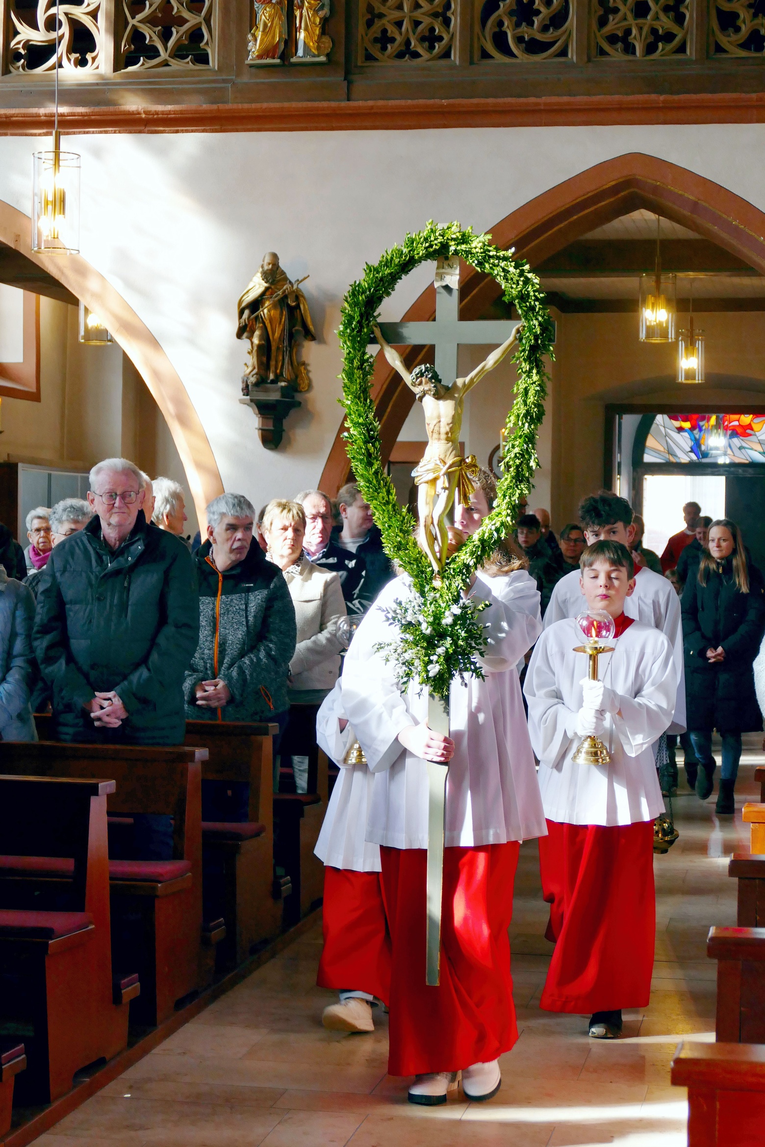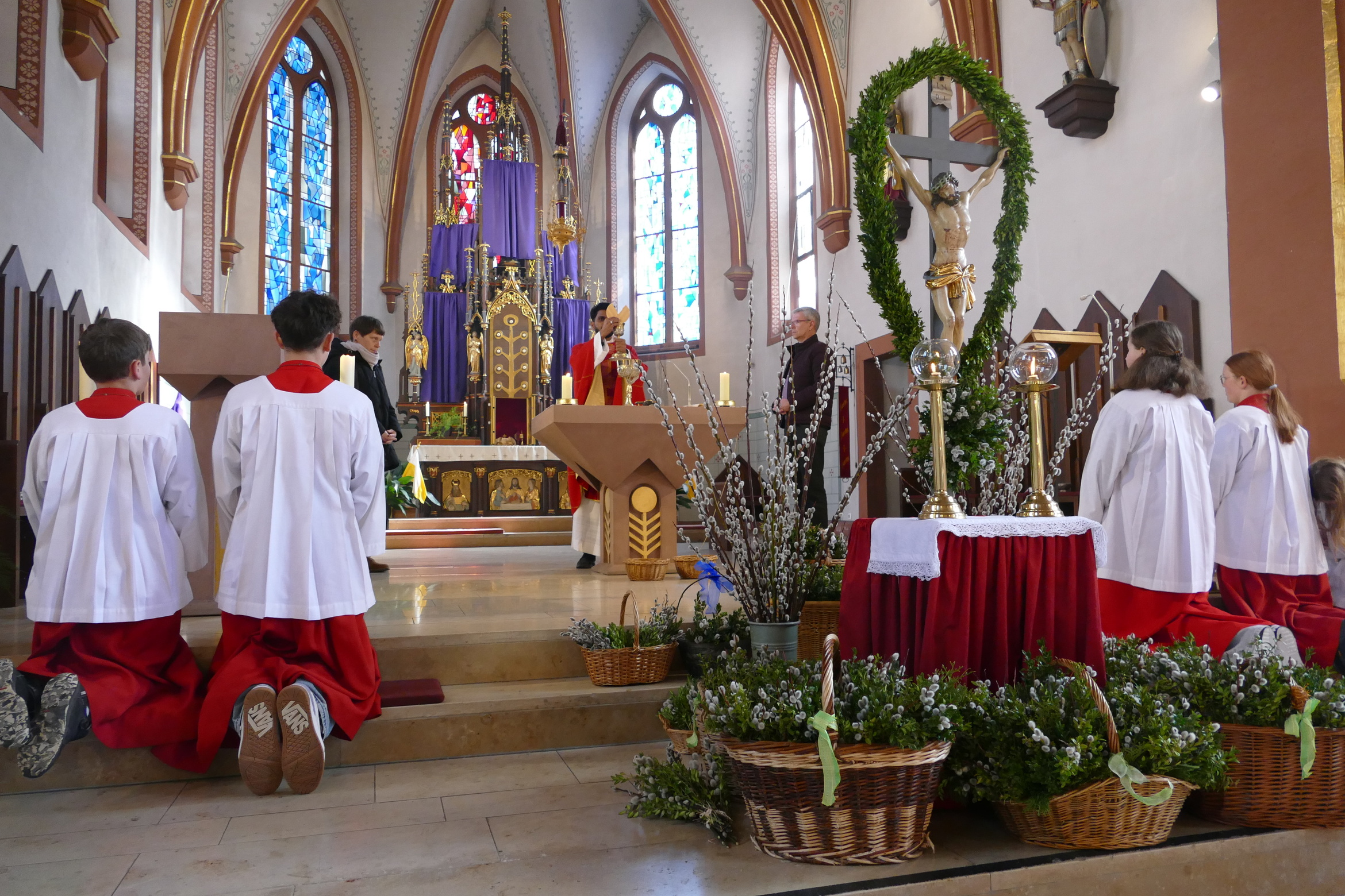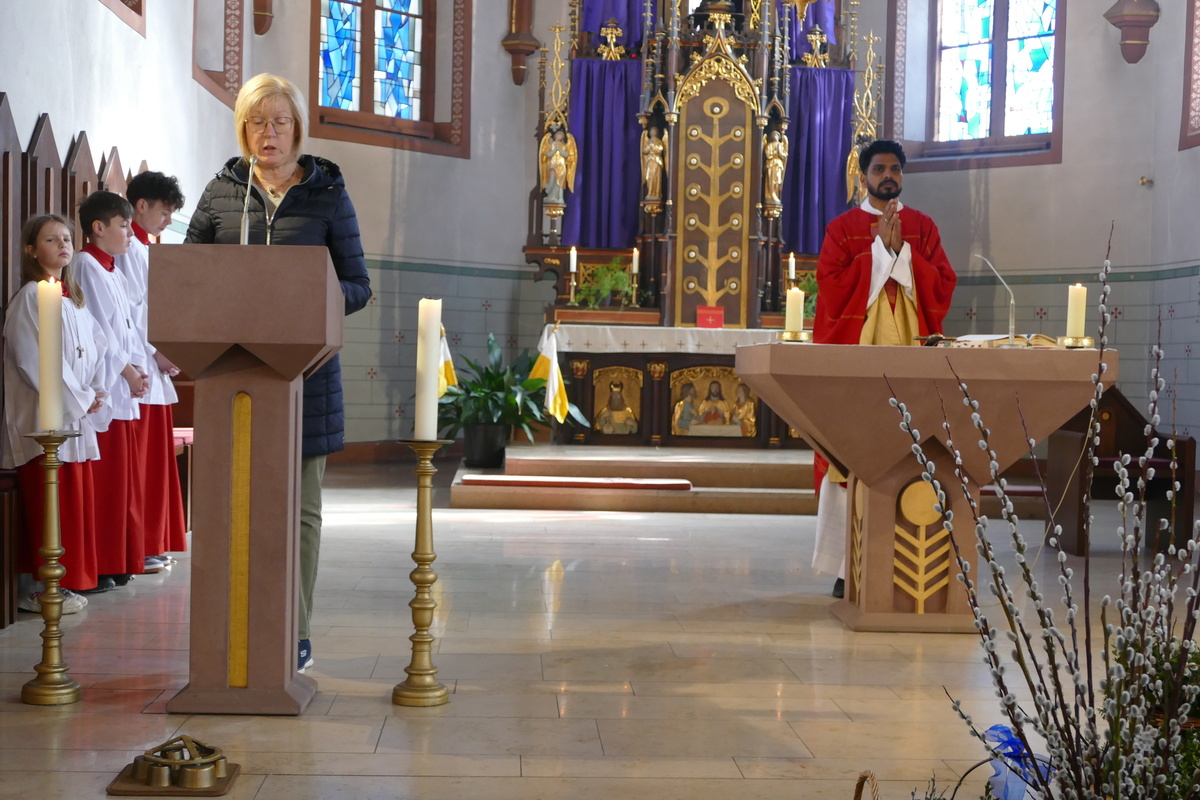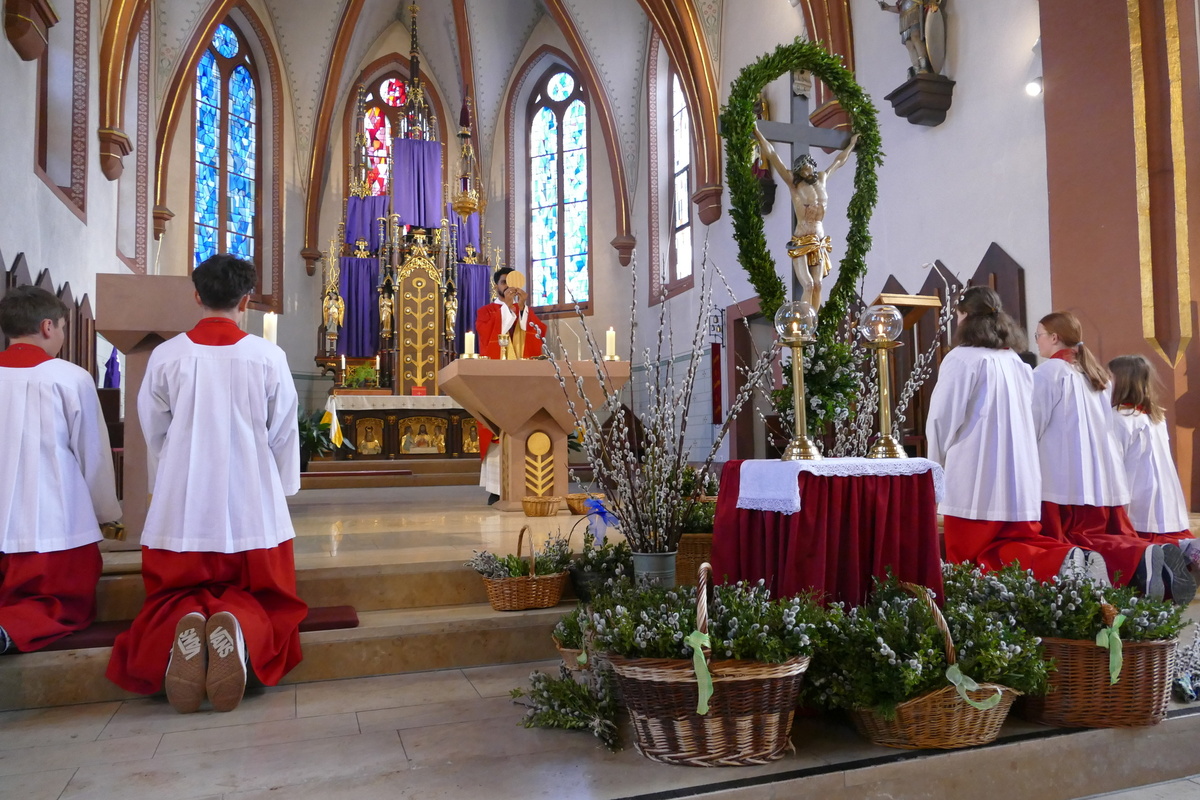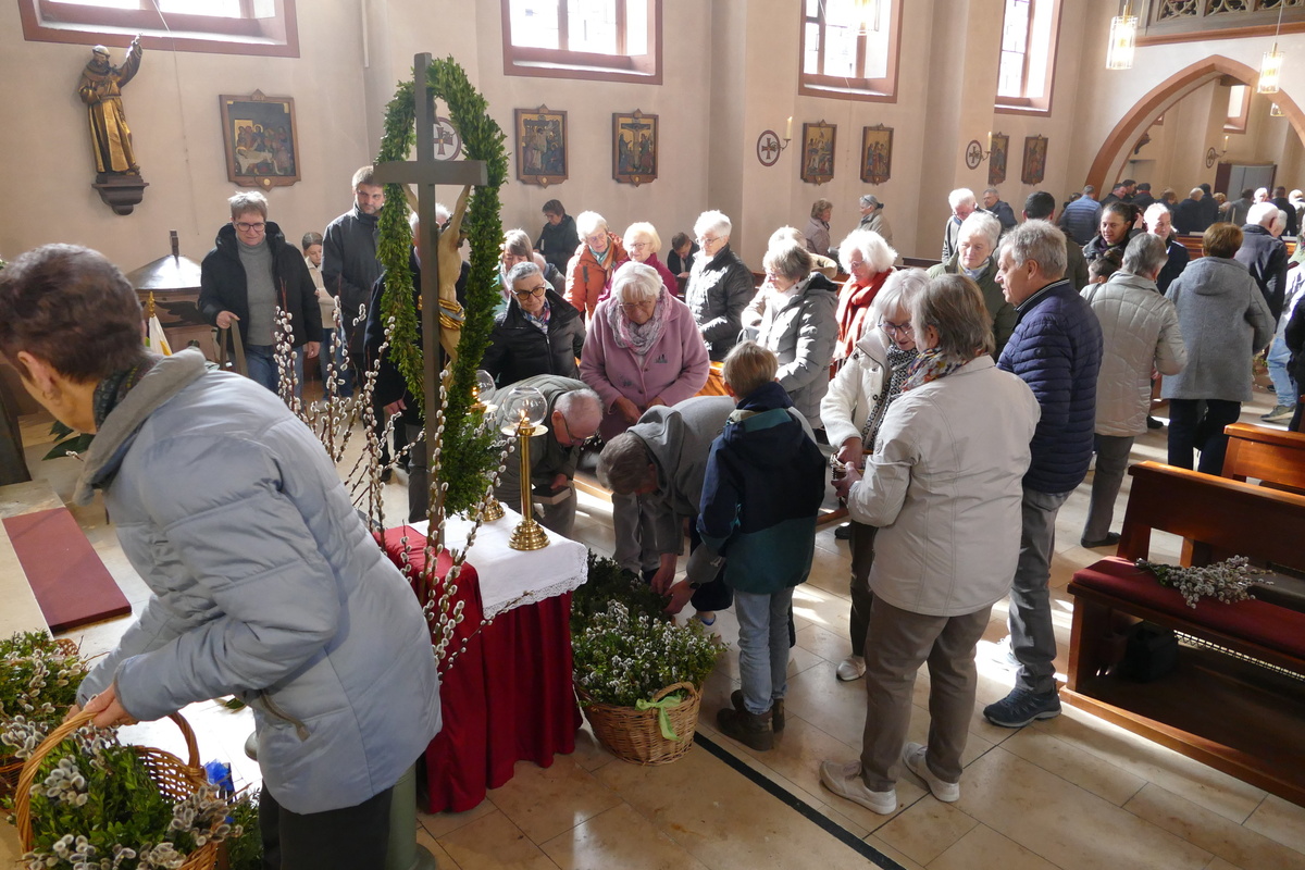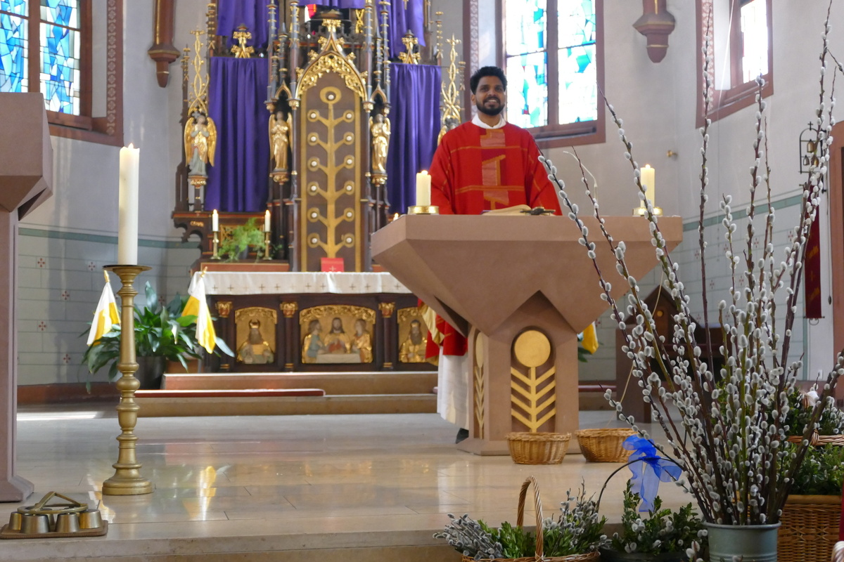 Gemeinsam mit den Kindern der Kinderkirche, ihren Betreuerinnen und dem Altardienst ist am Palmsonntag um 10 Uhr Pater Nidhin (Kloster Engelberg) feierlich in die Pfarrkirche in Kirchzell eingezogen. Vor dem Altar waren viele Palmsträuße und Palmzweige in großen Gefäßen und Körben aufgestellt, die von fleißigen Frauenhänden in der Woche zuvor gebunden worden waren. Pater Nidhin segnete die Palmsträuße. Die Kinderkirchenkinder und ihre Betreuerinnen gingen anschließend ins Pfarrheim, um dort kindgerecht den Palmsonntag zu erleben. Nach dem Vorlesen der Passion durch die Lektoren und dem Evangelium durch Pater Nidhin ging dieser in seiner Ansprache auf den Einzug Jesu in Jerusalem ein. Die Kernaussage lautete: „Jesus kommt nicht auf einem großen Pferd, sondern auf einem Esel und in Frieden. Wahre Größe ist nicht Macht, sondern Liebe und Demut.“ Diese Gedanken begleiteten den gesamten Gottesdienst. Am Ende der Messfeier wurden die Palmsträuße gegen eine Spende für soziale Zwecke an die Gottesdienstbesucher abgegeben.