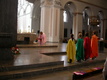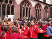 Die Fürbitten tragen Schülerinnen der Volkacher Mädchenrealschule vor. Währenddessen bringen Mitschülerinnen ihre ganz eigenen Bitten mit Körben voller Briefe zum Altar. Die Mädchen sind in bunte, glänzende Stoffe gehüllt, die sich mit ihrer satten Farbigkeit einreihen in die Komposition des Altarraumes. Nach den Fürbitten formieren sich die Schülerinnen. Ihre Gewänder beginnen im Takt zu schwingen. Leichtigkeit und Harmonie erfüllen den Raum. Mit ihrem liturgischen Tanz verleihen die Mädchen ihren Fürbitten einen noch tieferen Ausdruck. Obwohl über 1300 Menschen im Dom versammelt sind, ist es ganz still. Nur die Klänge der Instrumente und das Rauschen der Stoffe sind zu vernehmen. „Segne uns, dass wir ein Segen sind“, stimmt der Chor des Egbert-Gymnasiums an, und die Gemeinde singt aus voller Kehle mit. Was da mit modernen Rhythmen und mit deutschen, aber auch mit vielen lateinischen Texten erklingt, ist etwas ganz Besonderes: Es ist eine Welturaufführung.