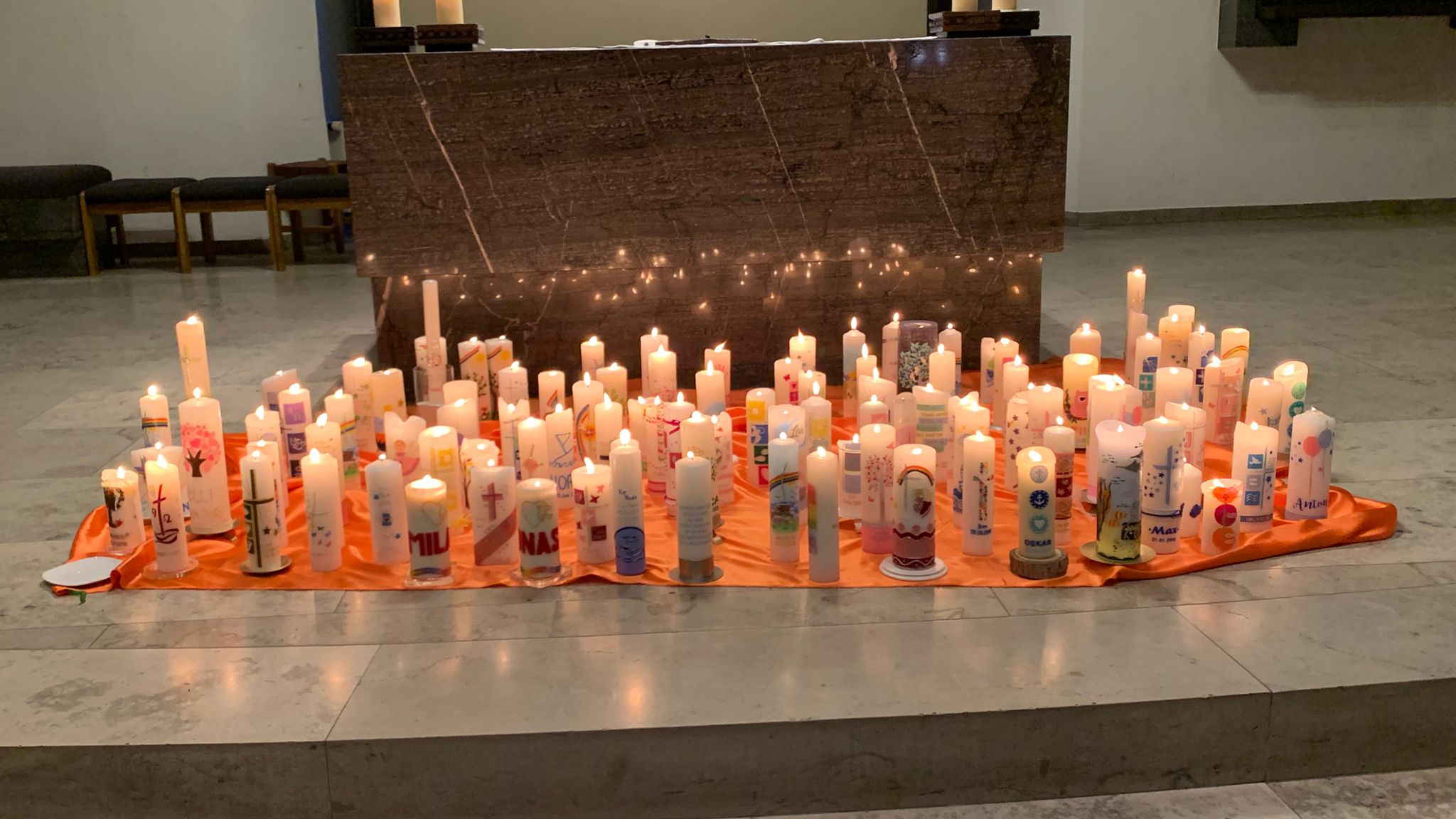 Ein besonders eindrucksvolles Bild bot sich, als die Kinder ihre Taufkerzen an der Osterkerze entzündeten: Über 100 Lichter erinnerten daran, dass der Glaube verbindet und trägt. Nachdem die Familien gemeinsam das Glaubensbekenntnis beteten, zeichneten die Kinder ihren Familienmitgliedern mit Weihwasser ein Kreuz auf die Stirn.