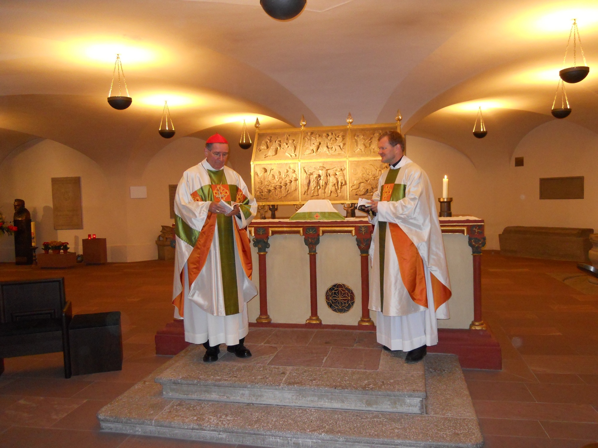 Würzburg (POW) Kardinal Roger Michael Mahony (74), Erzbischof von Los Angeles, hat dem Grab des heiligen Kilian und seiner Gefährten am Freitag, 10. September 2010, einen Kurzbesuch abgestattet. Zusammen mit 36 Pilgern aus seiner Erzdiözese machte er auf dem Weg von Oberammergau nach Frankfurt/Main Station in Würzburg. Bei der Messfeier in der Kiliansgruft ließ Kardinal Mahony sich von Dompfarrer Domkapitular Dr. Jürgen Vorndran auch über die zwei Tage zuvor von Bischof Dr. Friedhelm Hofmann für Mai 2011 angekündigte Seligsprechung von Georg Häfner informieren. Der amerikanische Gast zeigte sich beeindruckt vom Lebenszeugnis des Würzburger Märtyrerpfarrers, der im Konzentrationslager Dachau starb. Außer dem kurzfristig anberaumten Besuch im Neumünster standen die Festung Marienberg und eine fränkische Weinprobe auf dem Programm des Kardinals und seiner Pilgergruppe.