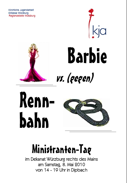 Die Regionalstelle für kirchliche Jugendarbeit in Würzburg hatte am Samstag, den 8. Mai 2010, einen Ministrantentag im Dekanat Würzburg rechts des Mains geplant. Unter dem Motto "Barbie vs. (gegen) Rennbahn" wollten wir gemeinsam mit der Oberministrantenrunde einen spannenden Tag für alle Ministrantinnen und Ministranten im Dekanat anbieten.