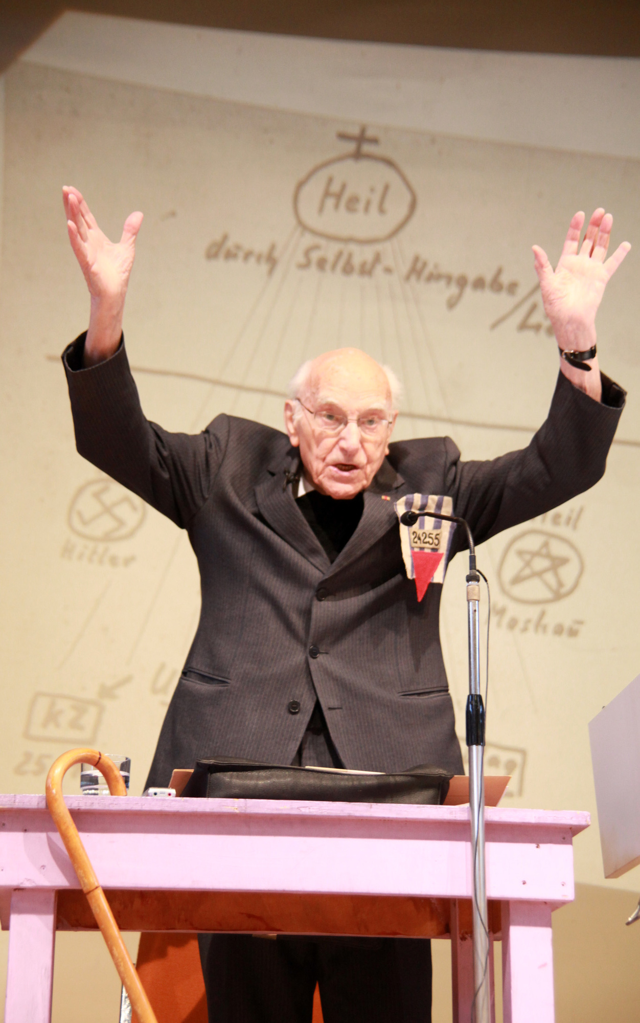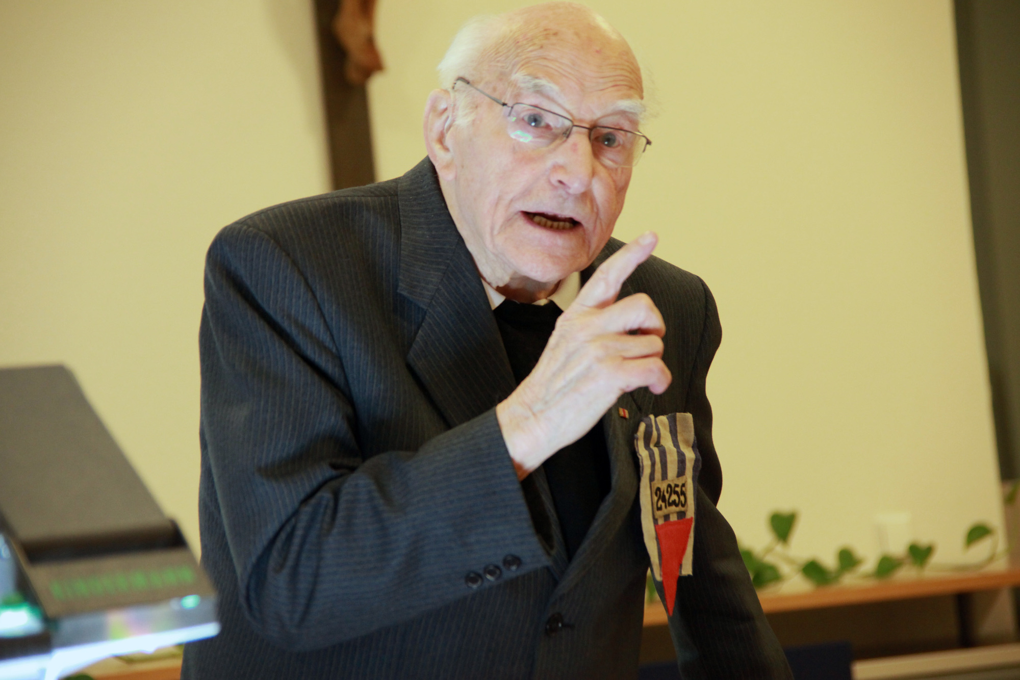 Würzburg/Münsterschwarzach (POW) Wer Prälat Hermann Scheipers zuhört, muss genau hinhören. Er redet leise, aber überzeugt von seiner schwersten Zeit im Leben. Für ihn ist es ein Wunder, überlebt zu haben. Der 97-Jährige war von 1941 bis 1945 im Konzentrationslager Dachau gefangen und lebte in derselben Stube wie Pfarrer Georg Häfner, der am 15. Mai im Würzburger Kiliansdom seliggesprochen wird. Am Mittwoch, 12. Januar, war Scheipers zu Besuch im Egbert-Gymnasium in Münsterschwarzach. Vor den Schülern, die derzeit die Aufführung eines Oratoriums zu Häfners Leben vorbereiten, berichtete er von seinen schrecklichen Erlebnissen.