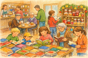 Auf liebevoll gedeckten Tischen wartet eine vielfältige Auswahl an Büchern für Kinder, Jugendliche und Erwachsene. Während die Kinder neugierig durch Bilderbücher und Geschichten blättern, können Erwachsene in Ruhe lesen, entdecken und sich inspirieren lassen.