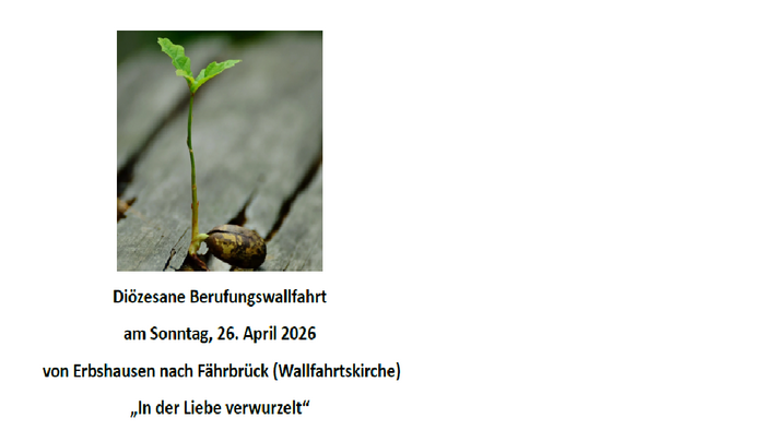 Die Wallfahrt wird vom Pastoralen Raum Bergtheim-Fährbrück sowie der Stabsstelle für Orden und geistliche Gemeinschaften organisiert. Sie wird in diesem Jahr unter dem Thema des Weltgebetstages um geistliche Berufe „In der Liebe verwurzelt“ stattfinden. Domvikar Manuel Thomas aus dem Referat Spiritualität wird uns bei der Wallfahrt begleiten und der Eucharistie vorstehen.