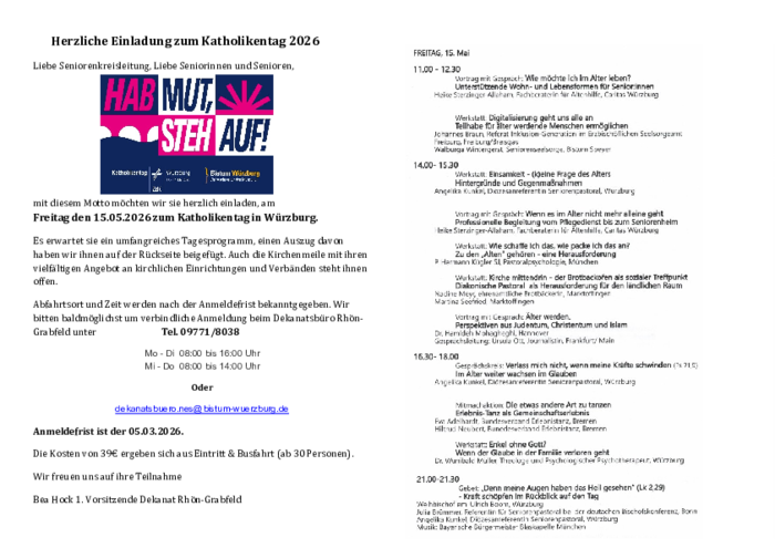 Freitag den 15.05.2026 zum Katholikentag in Würzburg. Es erwartet sie ein umfangreiches Tagesprogramm, Auch die Kirchenmeile mit ihren vielfältigen Angebot an kirchlichen Einrichtungen und Verbänden steht ihnen offen.