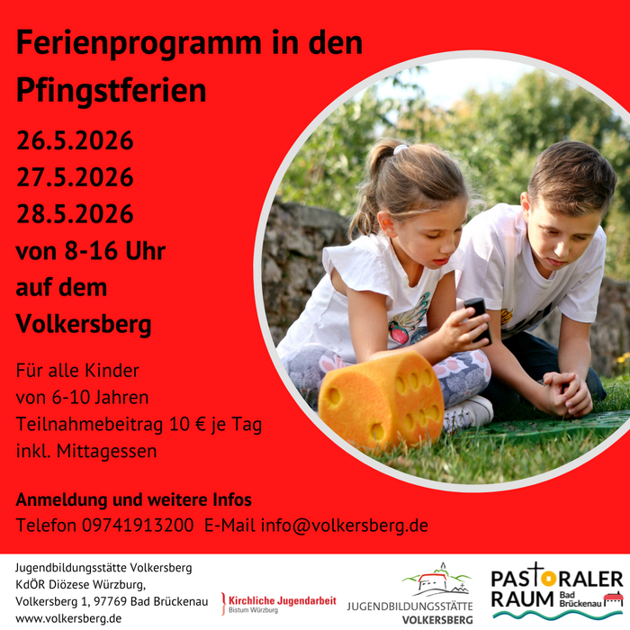 Am 26.5.2026, 27.5.2026 und 28.5.2026 bietet die Jugendbildungsstätte Volkersberg jeweils von 8-16 Uhr ein Ferienprogramm an. Kinder im Alter von 6-10 Jahren sind eingeladen, zum Spielen, Basteln, Sporteln und vielen tollen Erlebnissen auf den Volkersberg zu kommen. Der Teilnahmepreis inkl. Mittagessen beträgt 10 € je Tag und Kind.