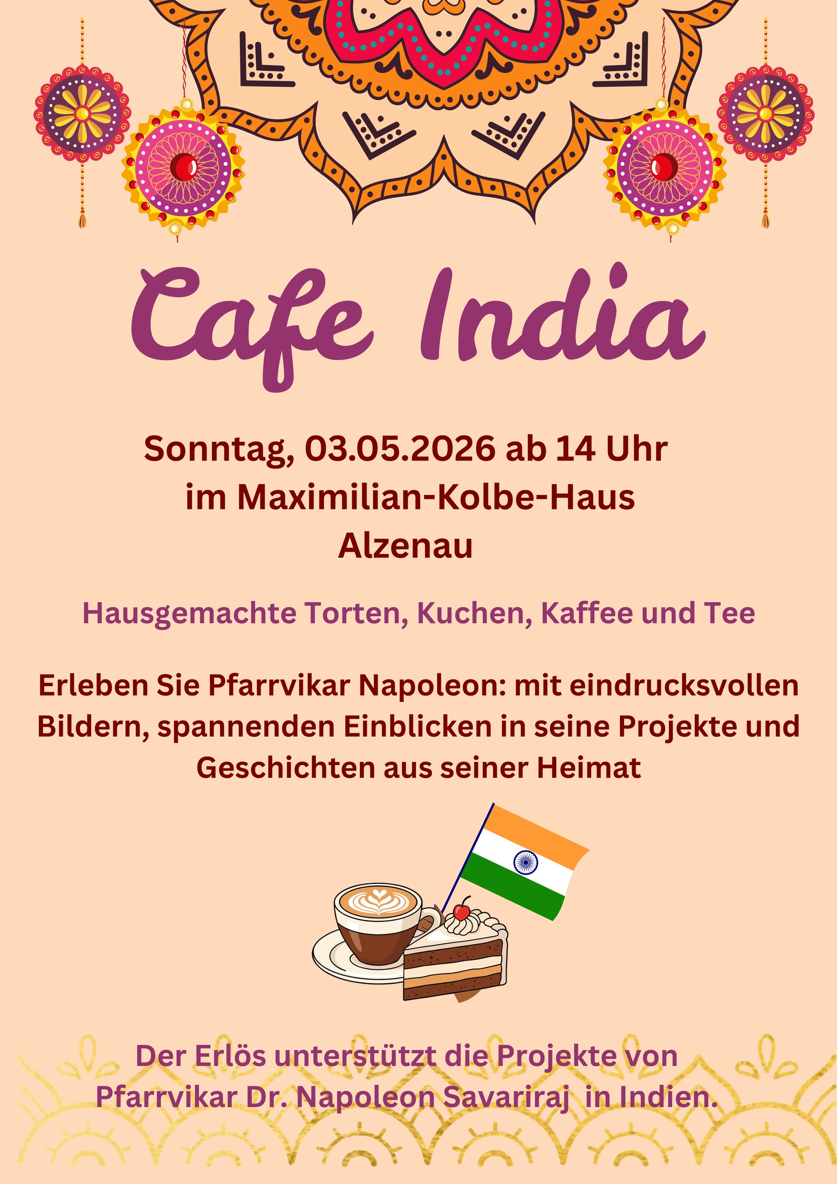 Am Sonntag, den 3. Mai 2026, ab 14 Uhr laden wir Sie herzlich in das Maximilian-Kolbe-Haus ein. Genießen Sie hausgemachte Torten und Kuchen sowie duftenden Kaffee und Tee in einer gemütlichen Atmosphäre.