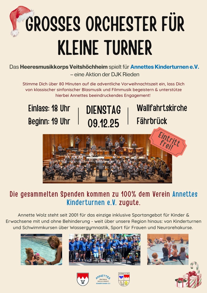 Das Heeresmusikkorps Veitshöchheim und die DJK Rieden versprechen einen musikalischen, bewegenden und ganz sicher hörenswerten Abend mit Herz und Sinn. „Er passt außerordentlich gut in die Vorweihnachtszeit“, laden sie herzlich in die Wallfahrtskirche Fährbrück ein.