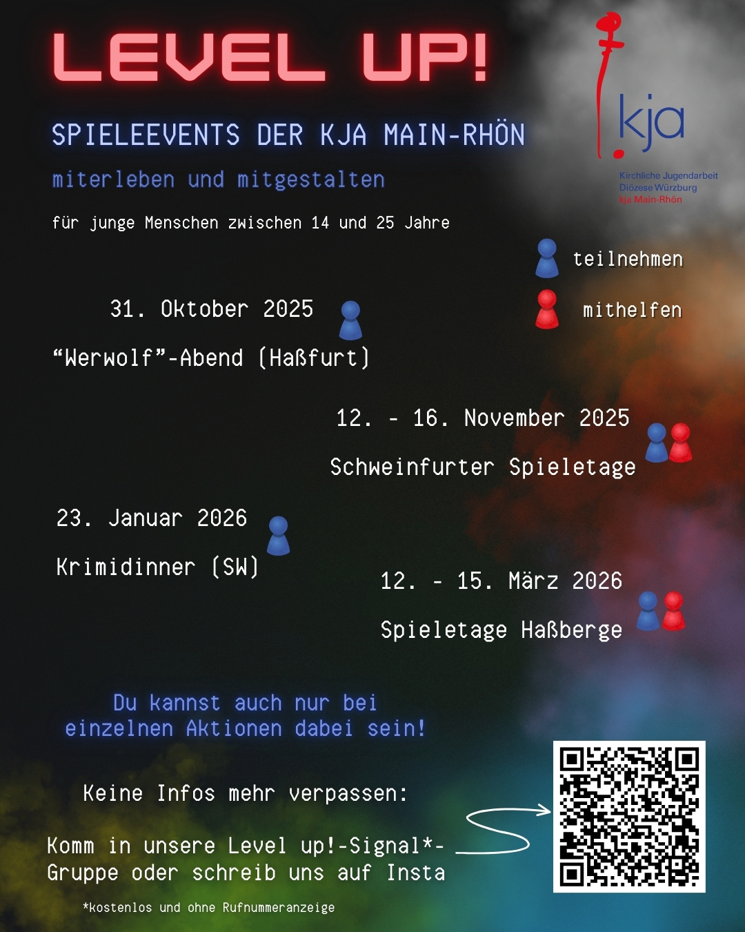 Wir bauen eine Community auf: Für alle 14- bis 25-Jährigen, die für Gesellschaftsspiele brennen. Du kannst in unsere Signal-Gruppe beitreten oder uns auf Insta (@kja.mainrhoen) mit dem Stichwort "Level-up!" anschreiben. Dort erhältst du dann alle Infos zu anstehenden Spieleevents.