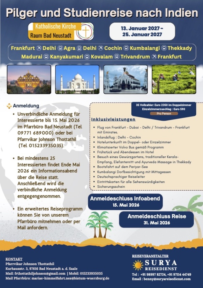 Am 18. Mai findet um 18 Uhr ein Informationsabend im indischen Restaurant In-Tisch, Spörleinstraße 34 in Bad Neustadt statt, bei der die verbindliche Anmeldung entgegengenommen wird. Bei Interesse melden Sie sich bis 15.05.26 im Pfarrbüro Bad Neustadt (Telefon 09771/689000) oder bei Pfarrvikar Johnson Thottathil (Telefon: 0152 33935035) an. Nähere Informationen entnehmen sie bitte dem Download "Programm Indienreise 2027".