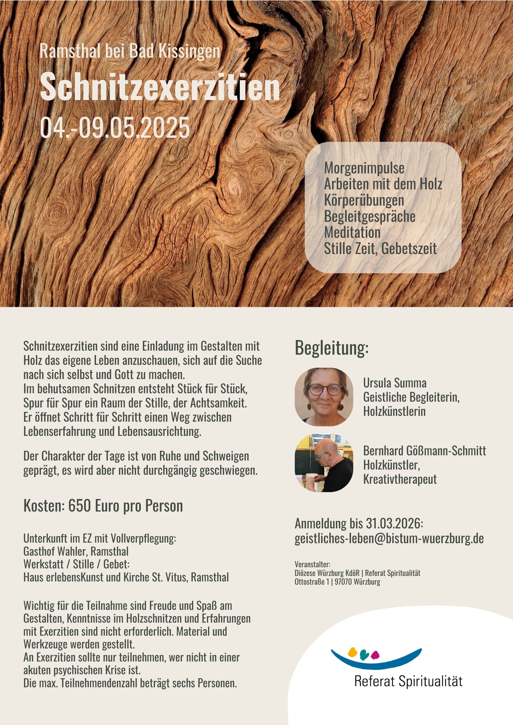 Schnitzexerzitien sind eine Einladung im Gestalten mit Holz das eigene Leben anzuschauen, sich auf die Suche nach sich selbst und Gott zu machen. Im behutsamen Schnitzen entsteht Stück für Stück,